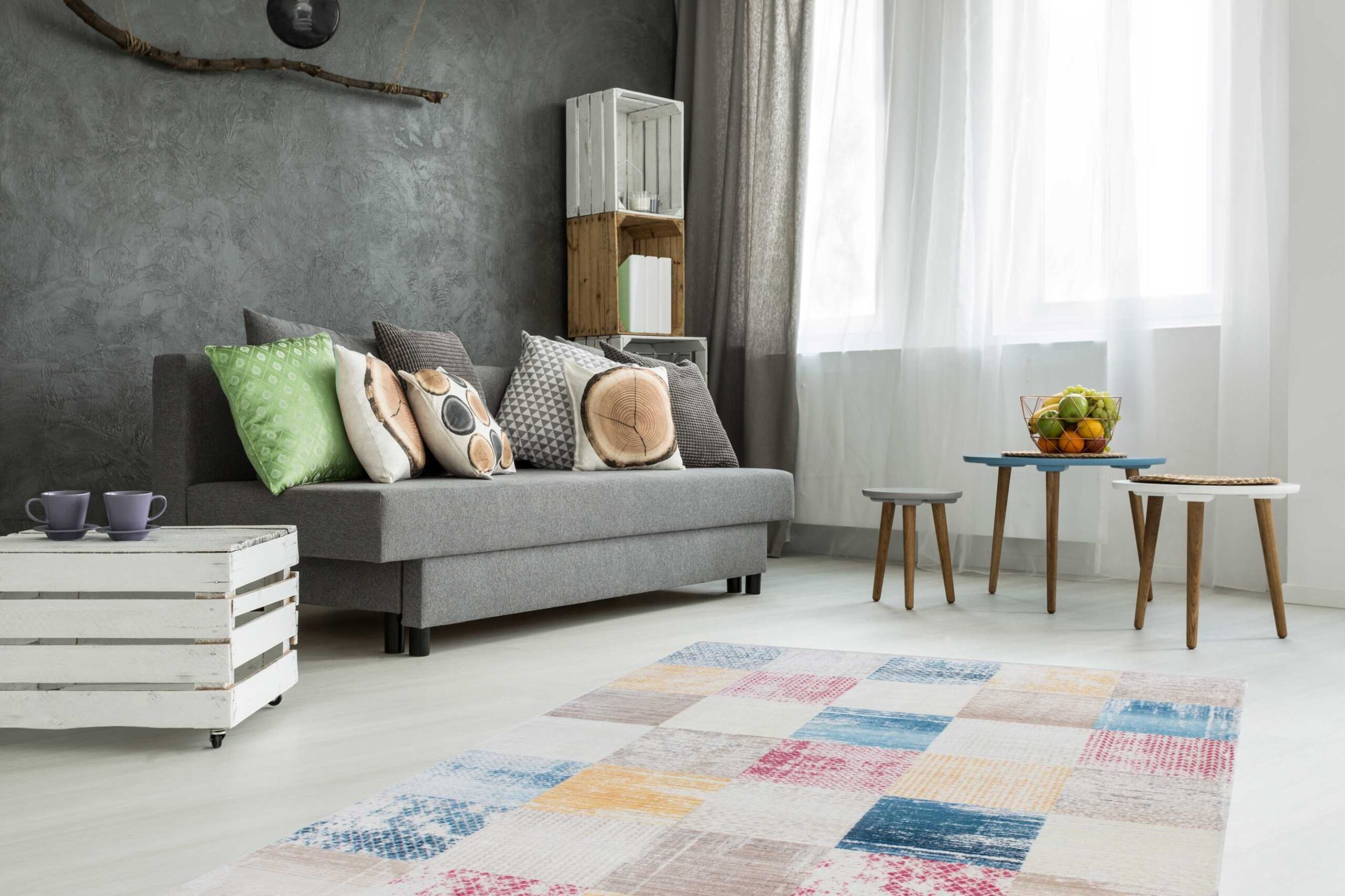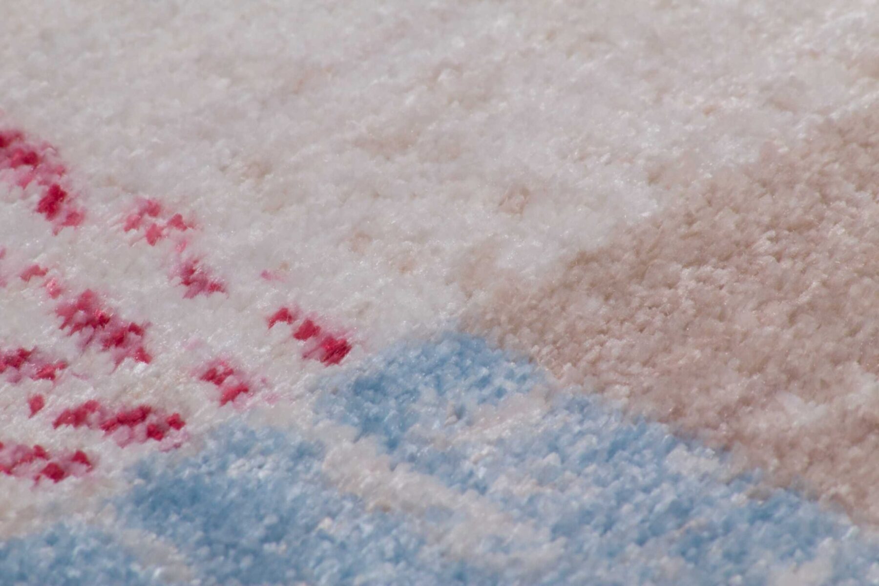The rug features geometrical tribal elements in an astonishing combination of contemporary colours; whilst the distressed look and colour coordinated fringes give the rug a faded, vintage feel. 100% Polyester yarn makes this rug highly durable, extremely soft, and easy to maintain.