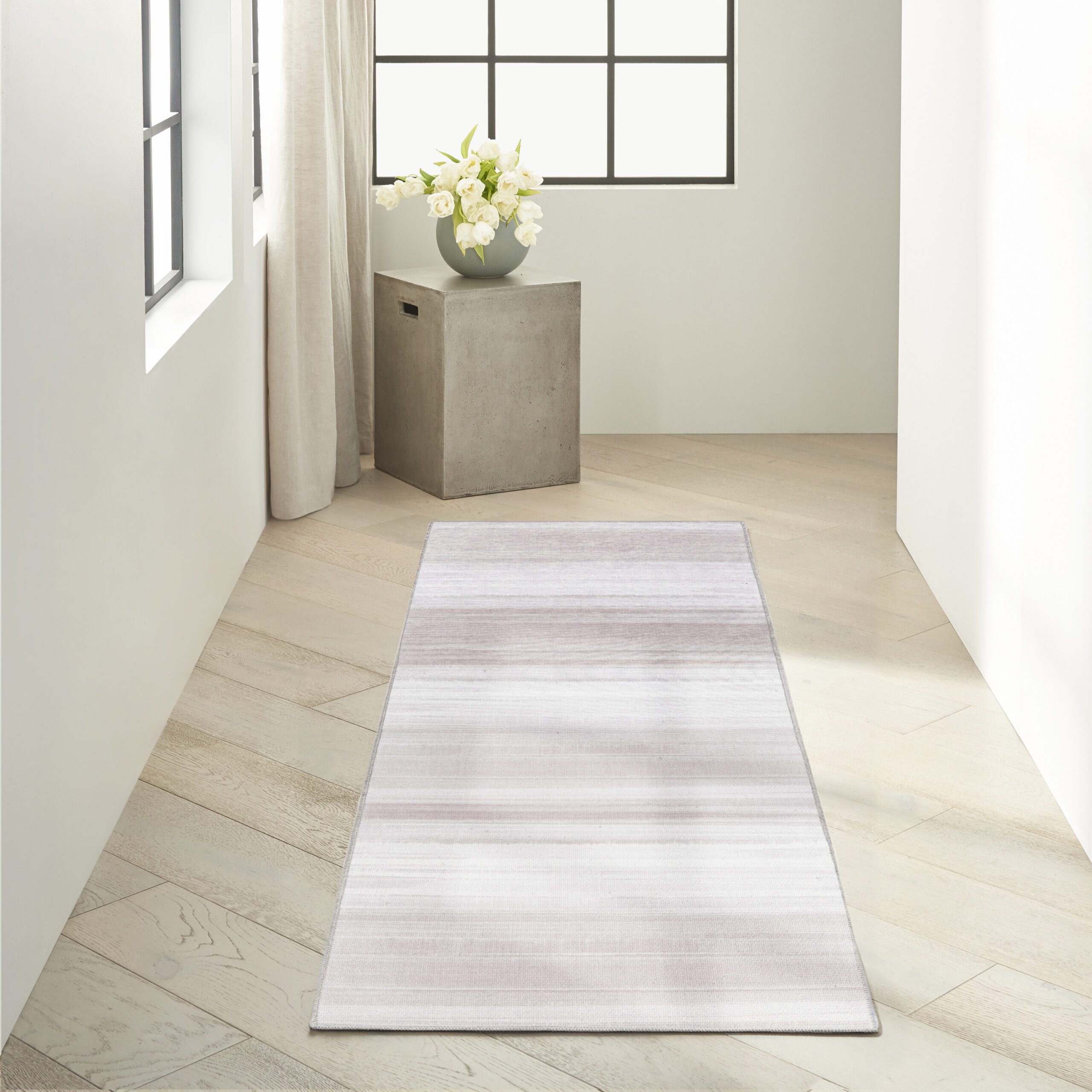 This washable rug from the Calvin Klein Launder Collection sparks a serene and calm energy. The abstract watercolor-like aqua design is flatwoven with a blend of polyester and cotton yarns, ideal for use in any room. Designed in neutral colors for home styling.