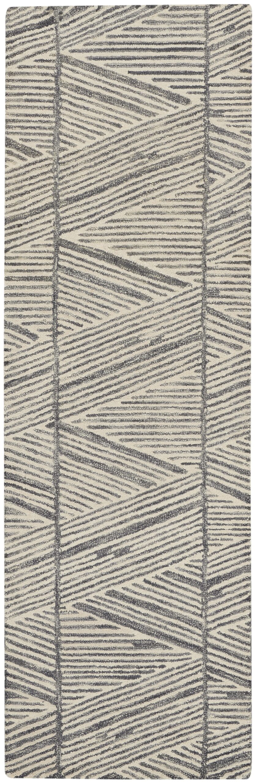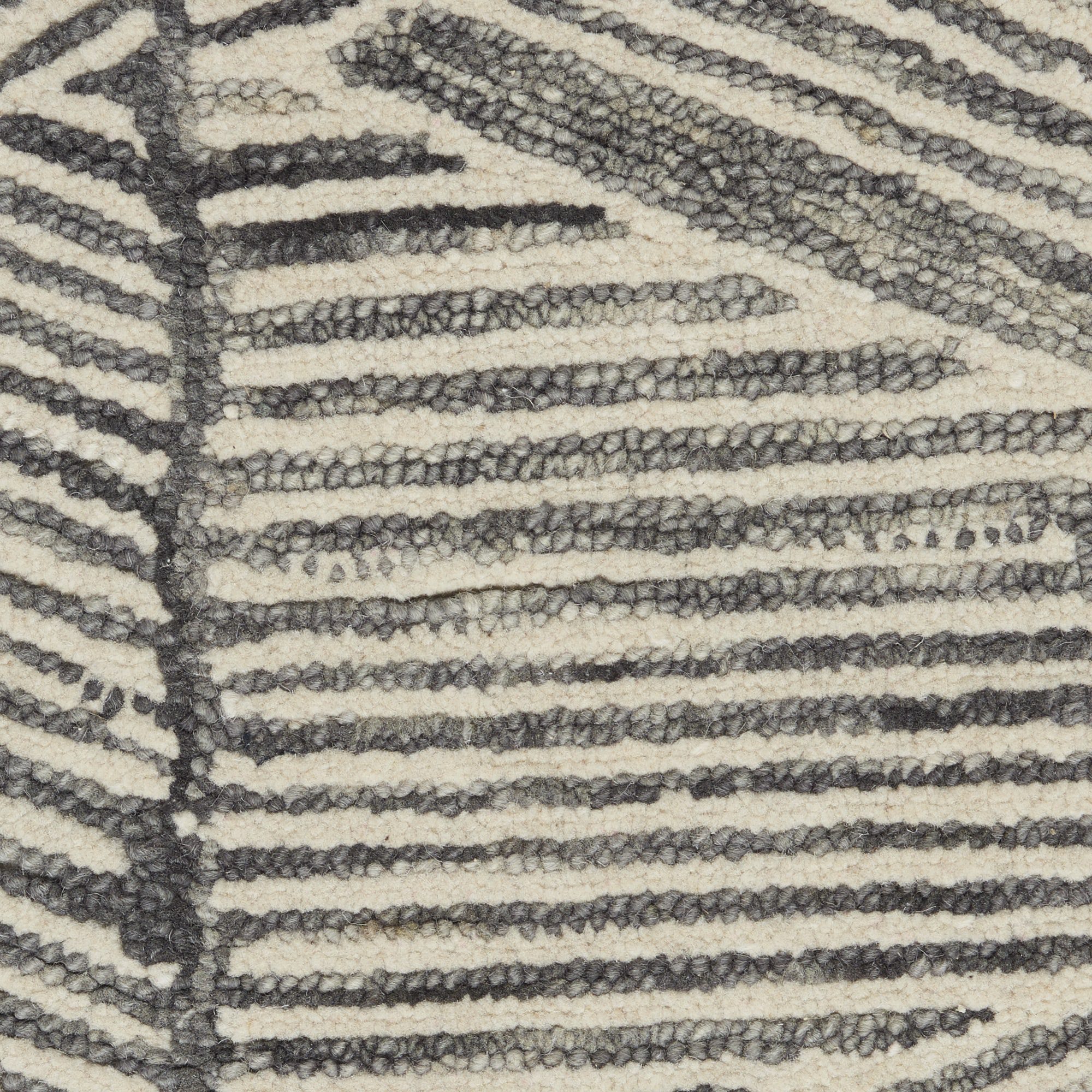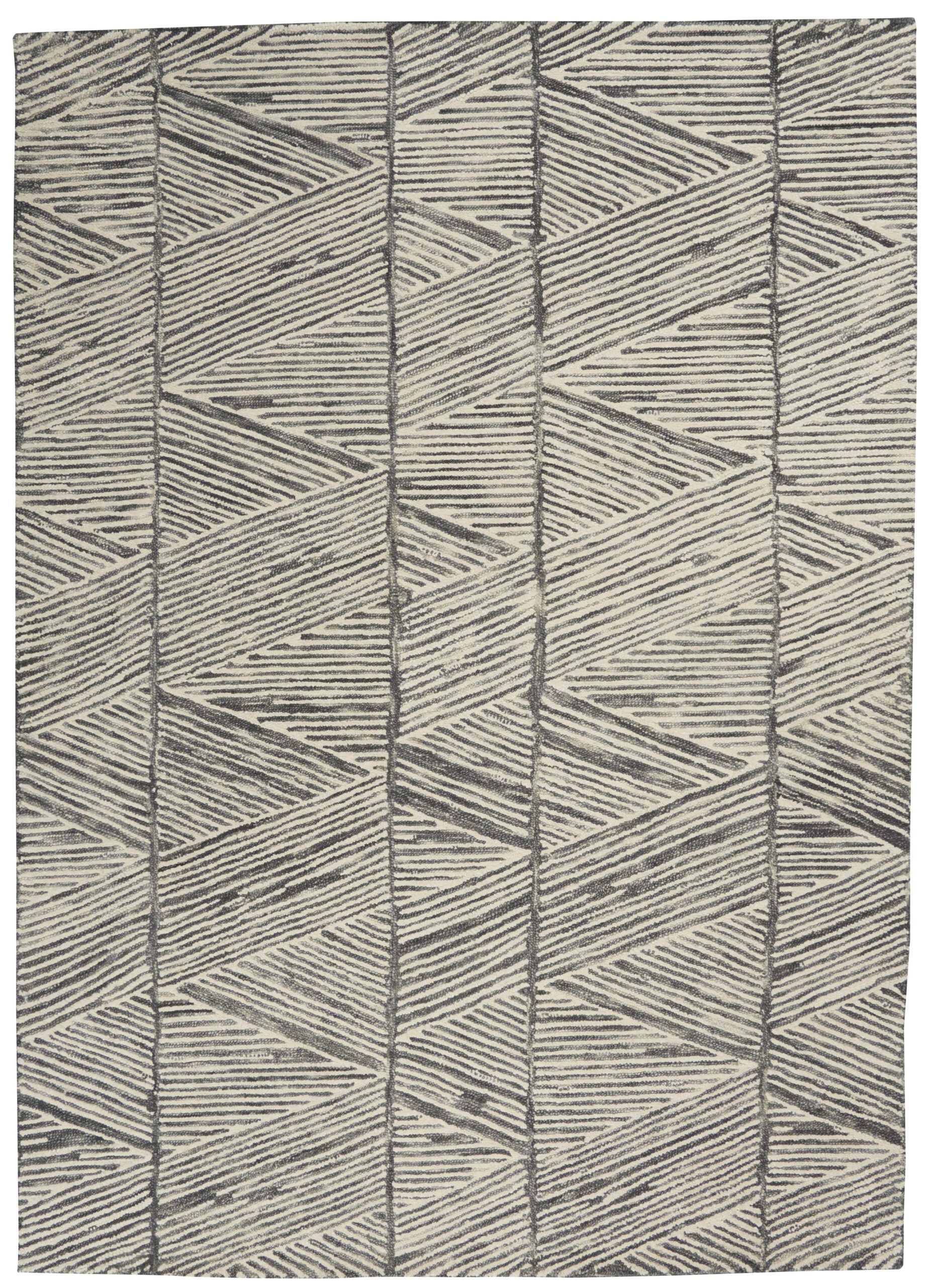 Bold and textural as tree bark, the graphic lines of this Colorado rug design move in counterpoint for a look as fresh as a mountain breeze. Its hand-tufted, loop pile lends an artisanal feel. Made of low-shed wool for both softness and durability, in a contemporary grey and white duotone.