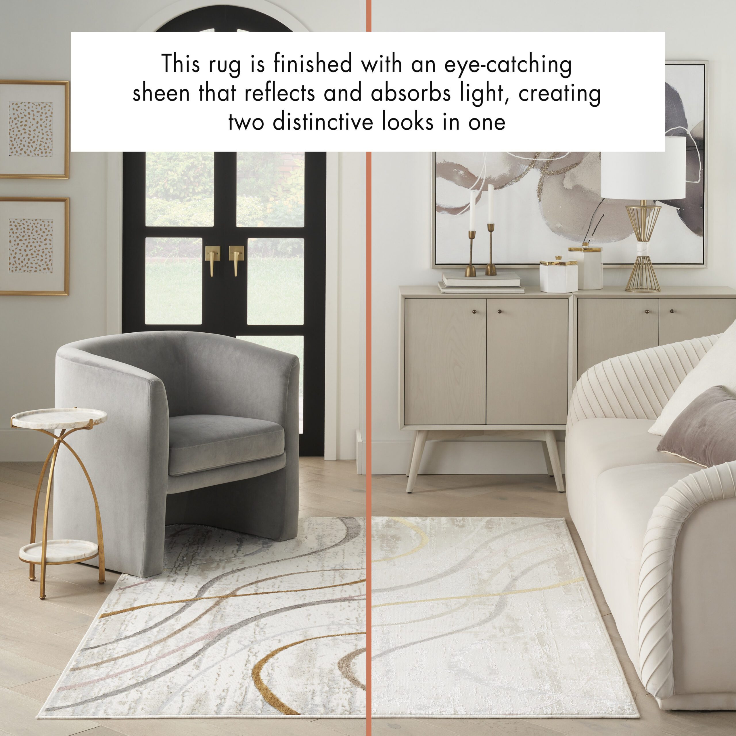 With its curvy linear pattern in pink, gold, and blue multicolour on an ivory ground, this abstract rug from the Glitz Collection adds a sense of movement to your décor. The contemporary design is enhanced with subtly raised accents and a shimmer that beautifully reflects changes in light. Machine-made from polyester yarns that feel comfortably soft underfoot.