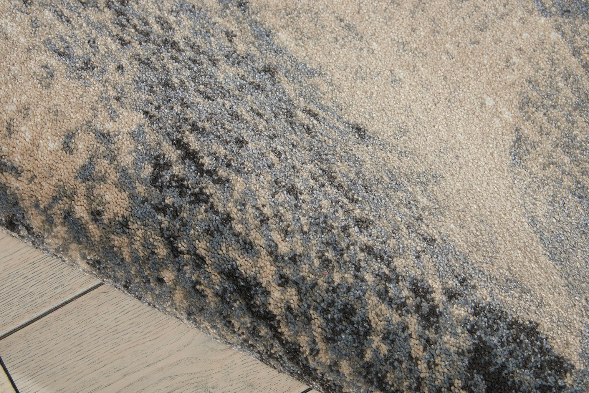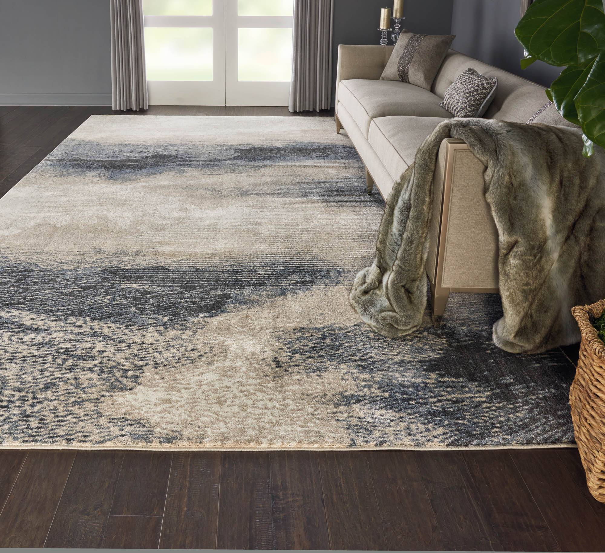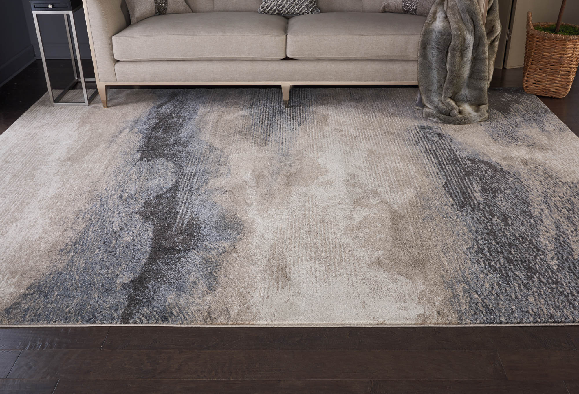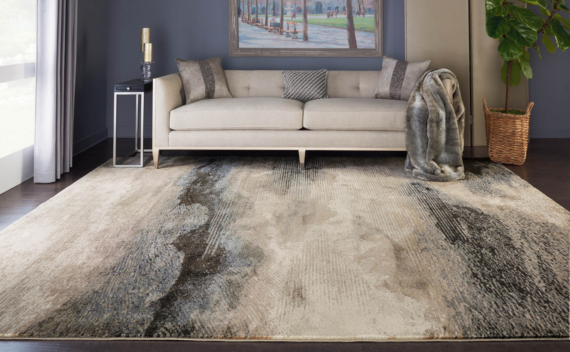 This magnificently modern Maxell area rug elicits images of abstract artistry. Simulated brush strokes and splashes of rich blue, navy, ivory, and grey tones play out on a silky cut pile for a beautiful touch of contemporary comfort in any room in the home.