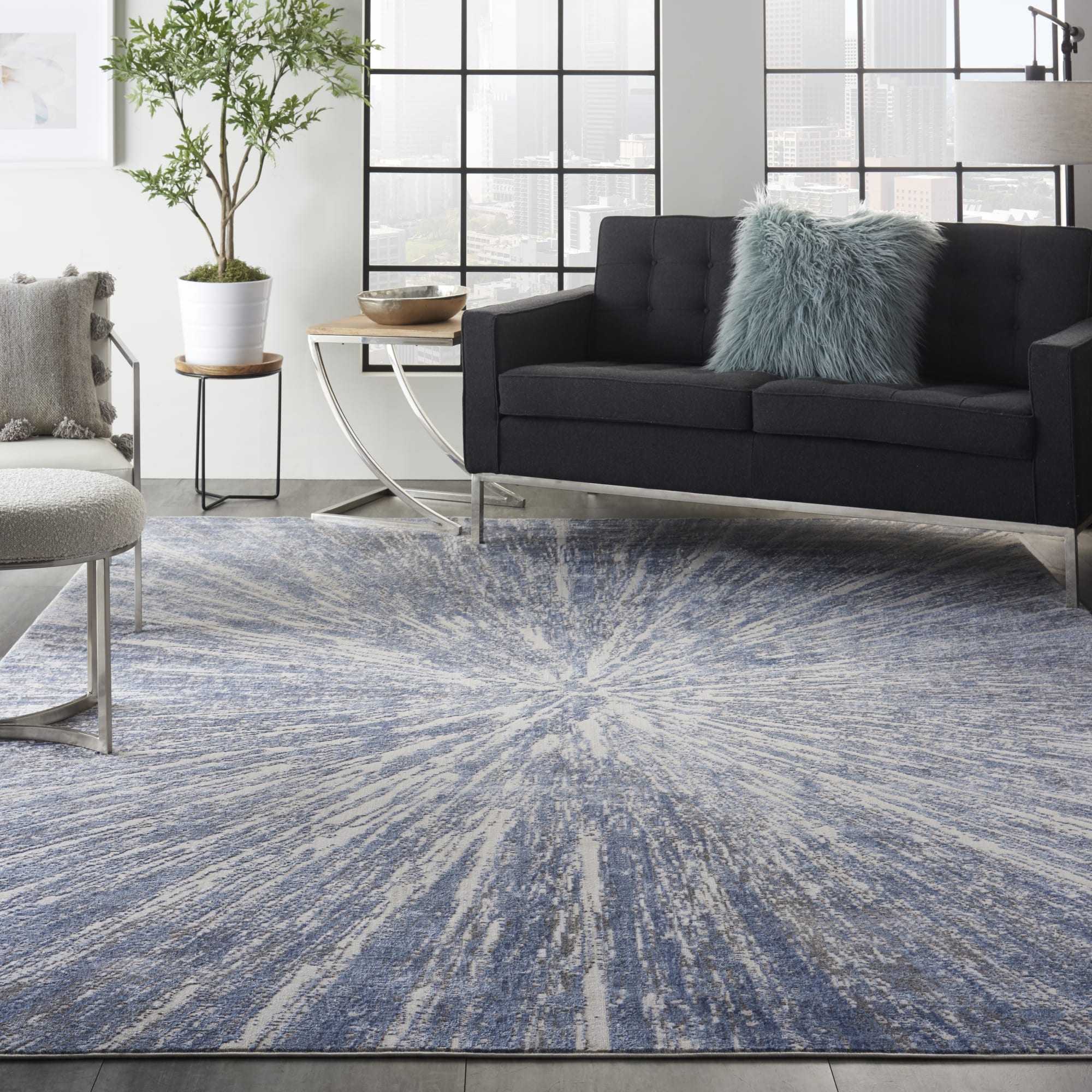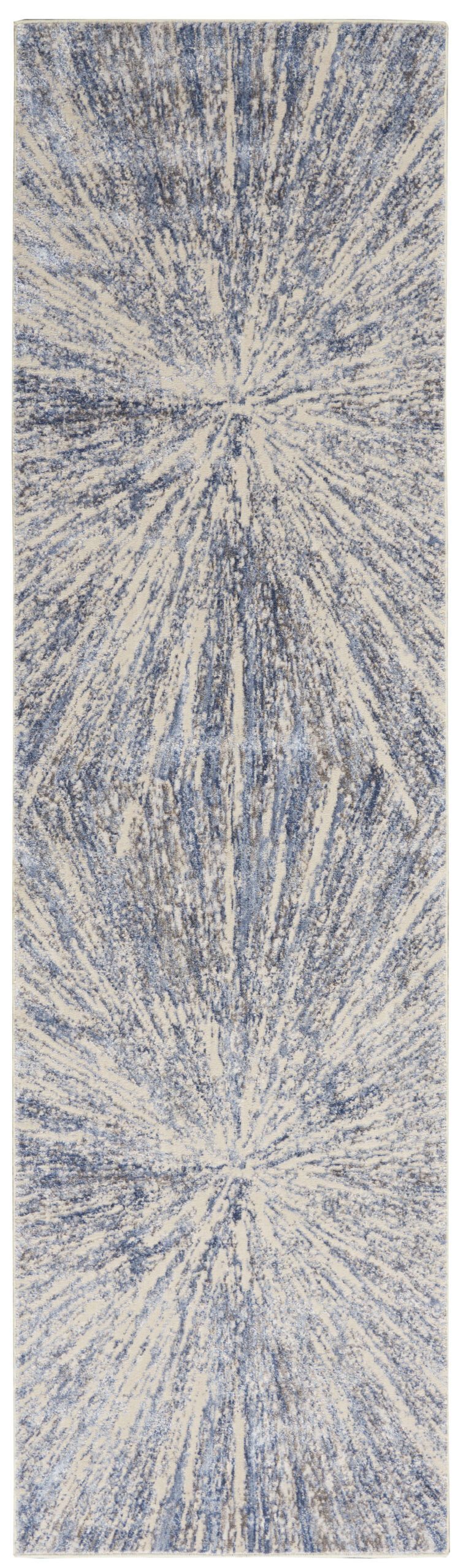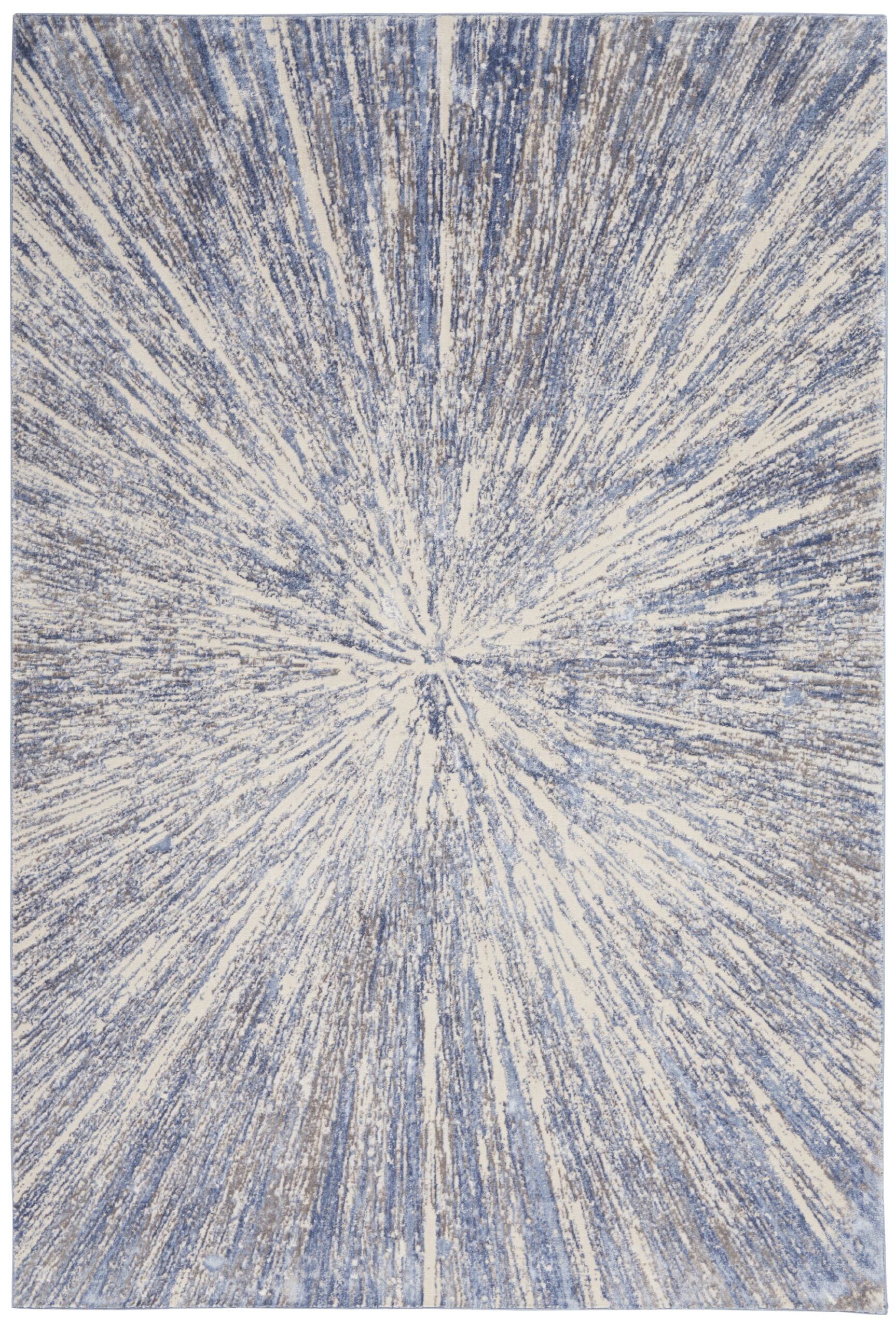 A contemporary starburst design creates a vortex of visual interest in this subtly spectacular Silky Textures rug. Its luminous beauty in celestial tones of blue on ivory brings a touch of modern sophistication to that special room in your home.