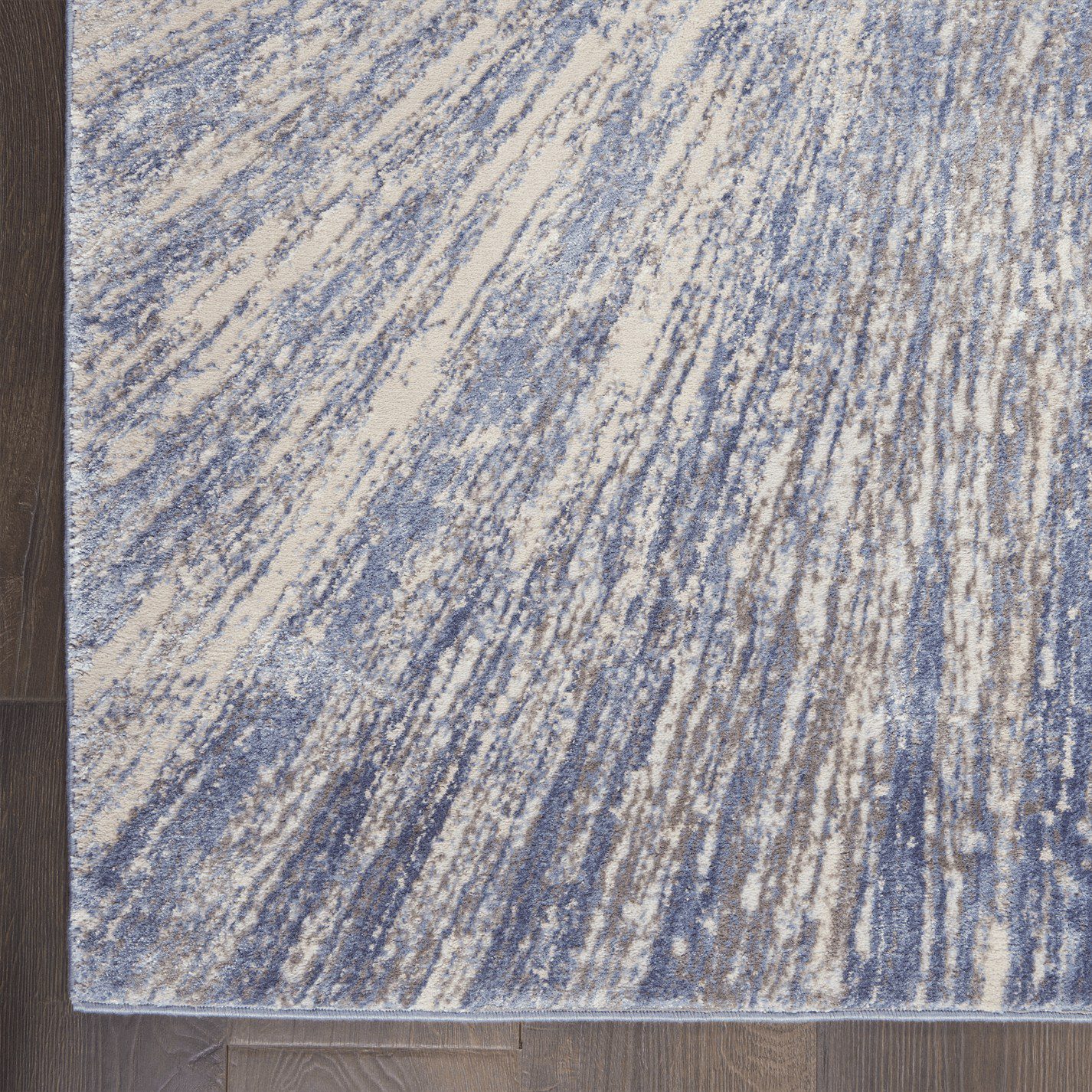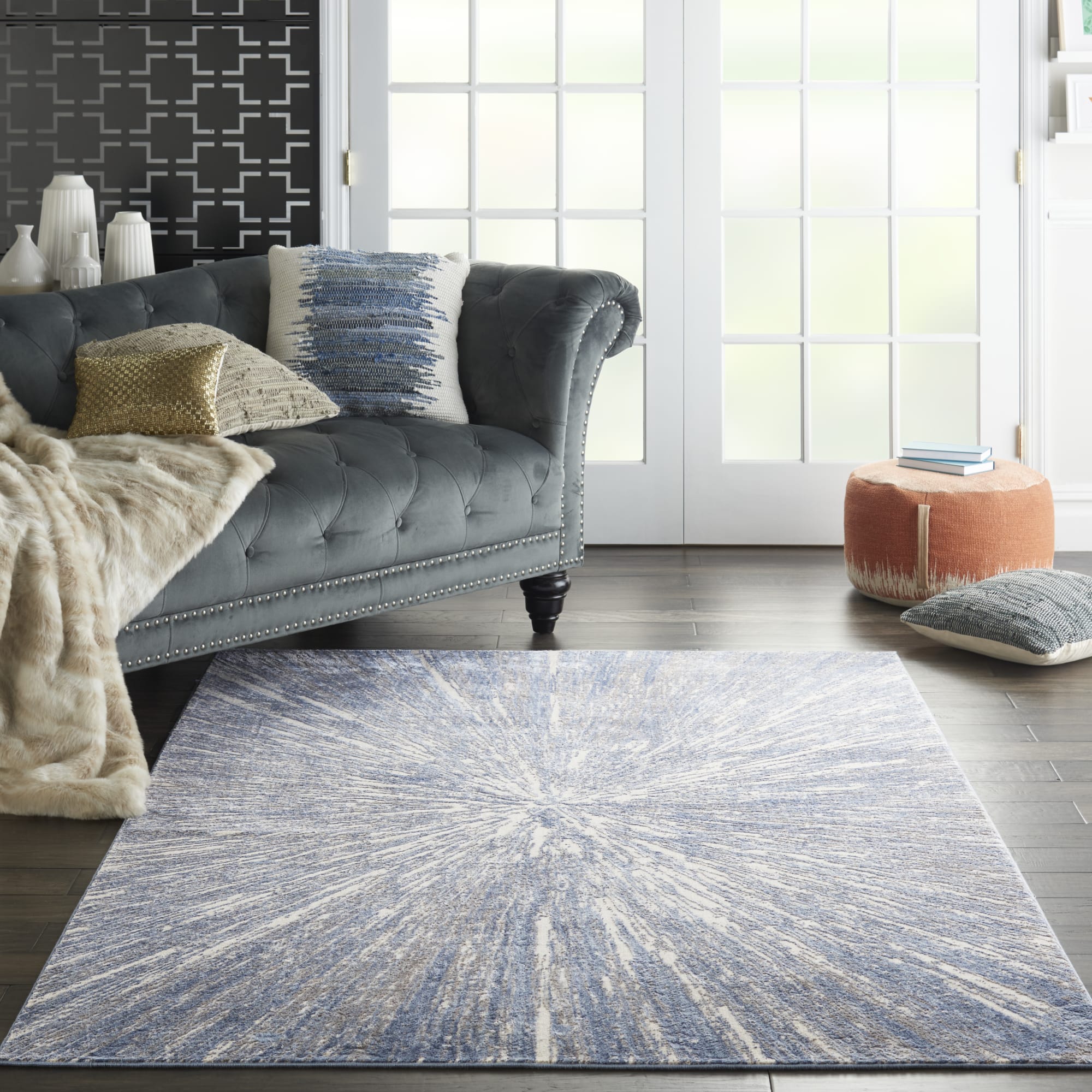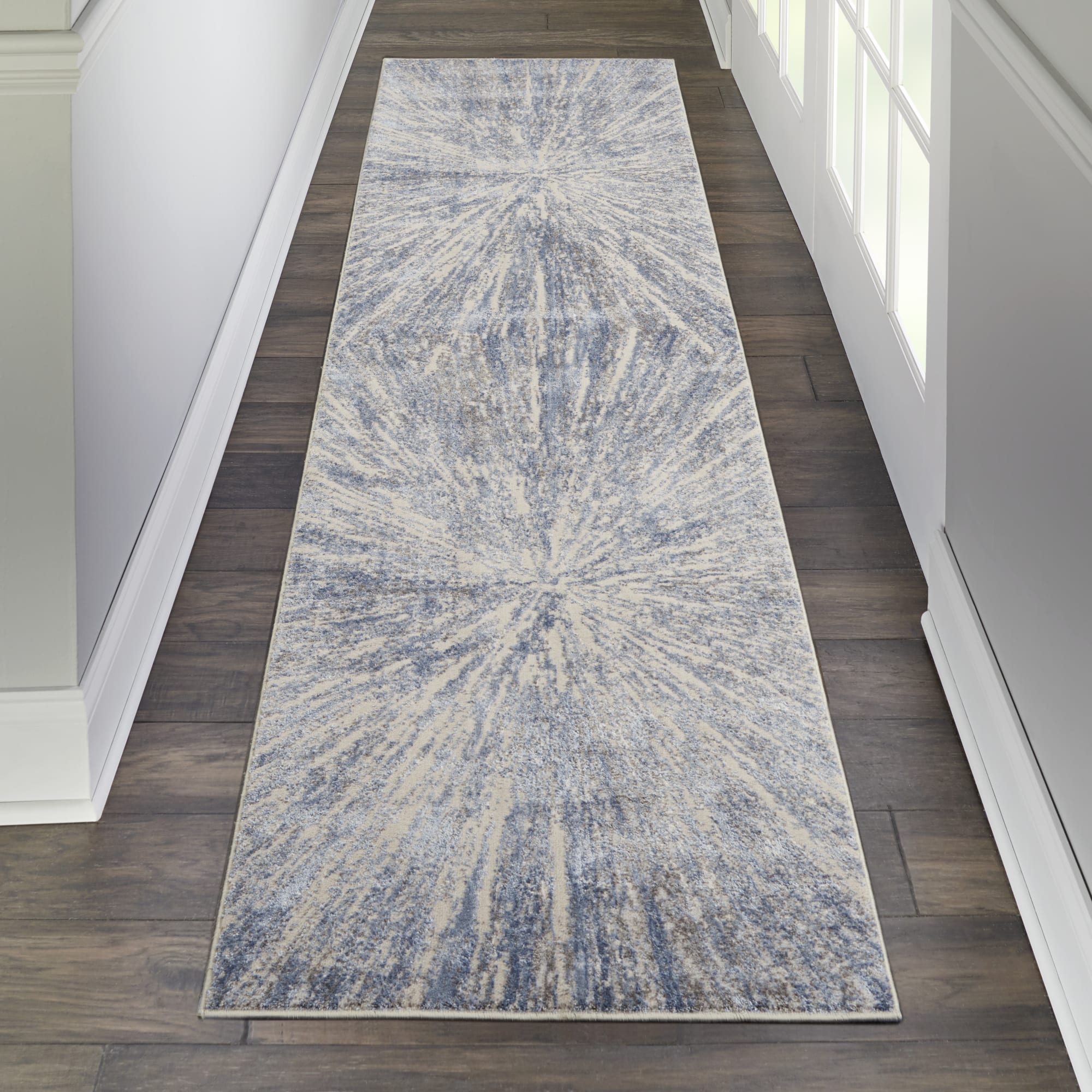 A contemporary starburst design creates a vortex of visual interest in this subtly spectacular Silky Textures rug. Its luminous beauty in celestial tones of blue on ivory brings a touch of modern sophistication to that special room in your home.
