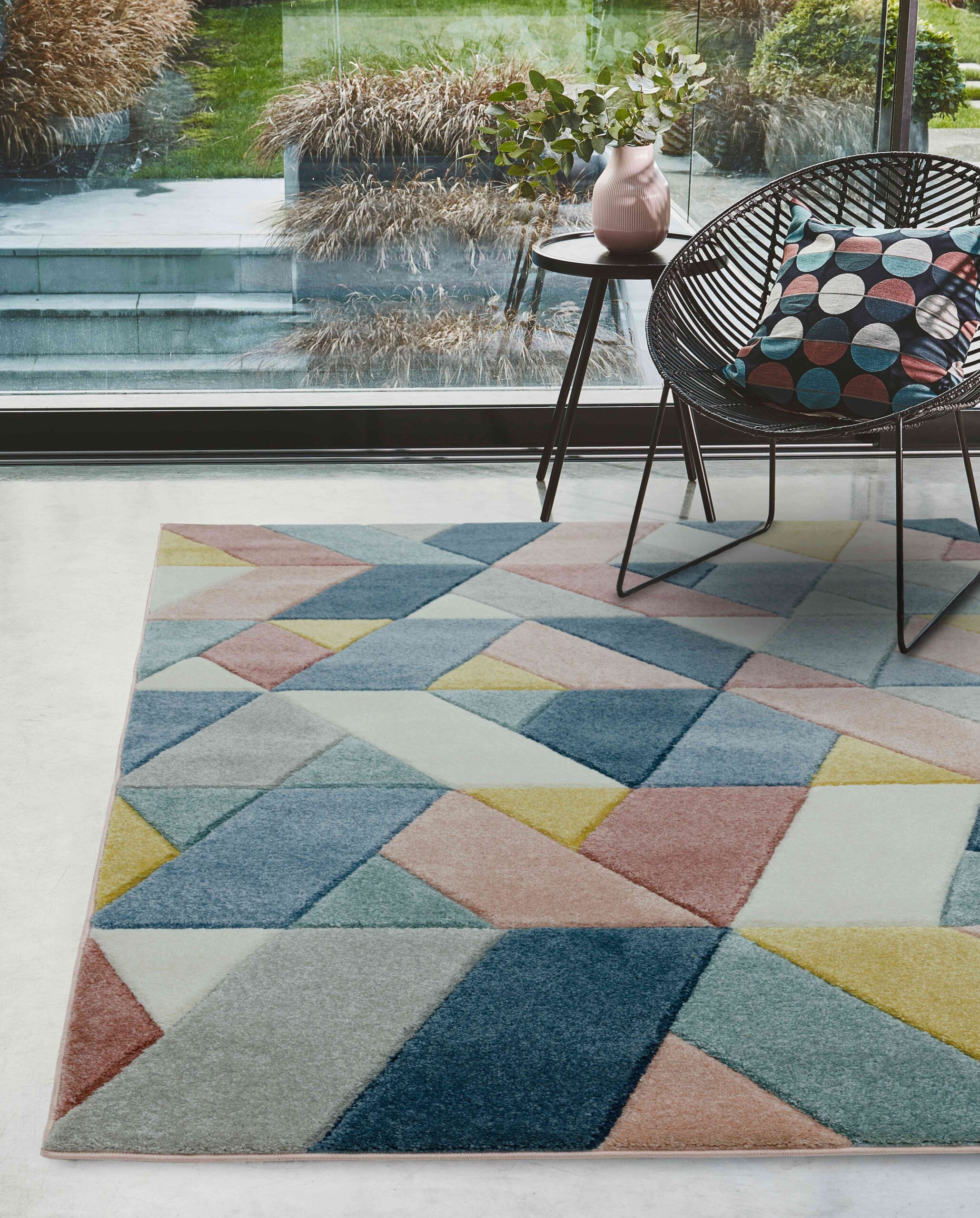 Bold geometric designs, hand carved to add texture and enhance depth of pile.